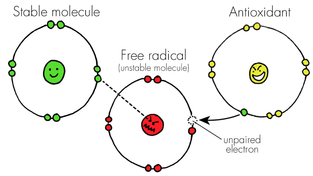 Antioxidants help to counteract this process by helping to make the unstable molecule stable. In more science-based terminology, antioxidants do this by donating one of their electrons to the unstable molecule, which then makes it stable and less reactive. This in turn prevents the cellular and tissue damage that would otherwise occur due to the unstable molecules attempting to grab electrons from other molecules that make up cells and tissues. Therefore, antioxidants can help to act as protective mechanisms to prevent or reduce inflammation, tissue damage, chronic diseases, and also improve cellular healing, daily performance, and long-term vitality.